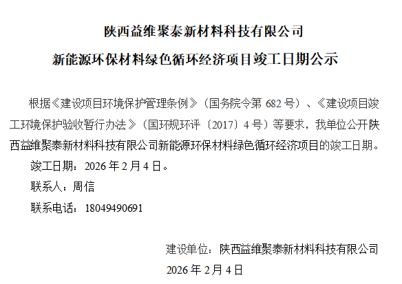 陕西益维聚泰新材料科技有限公司,新能源环保材料绿色循环经济项目竣工日期公示